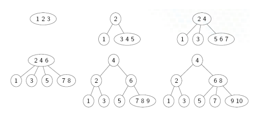 - Insert 7 → goes to [5, 6] → becomes [5, 6, 7] → split
