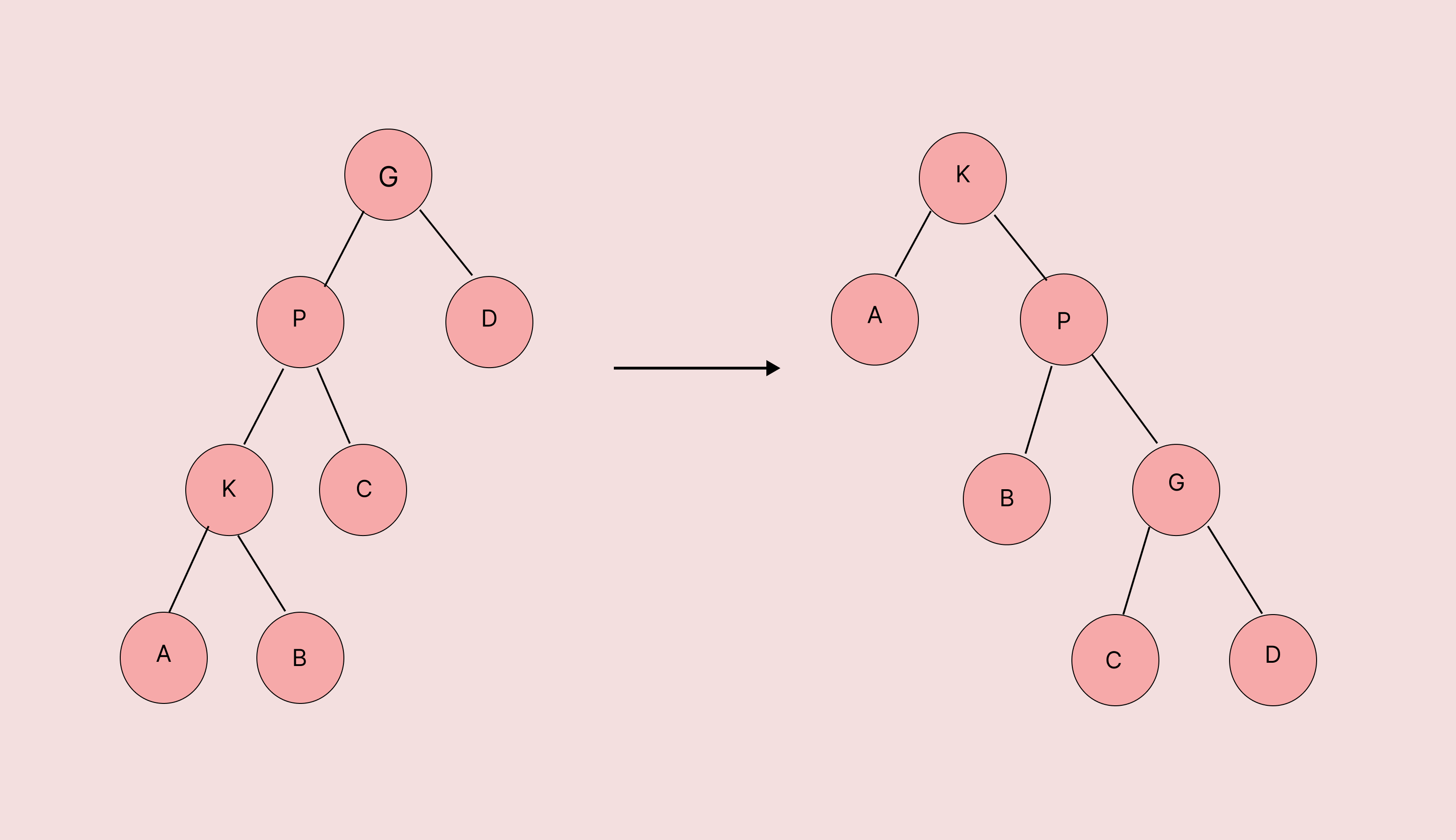 You’re strongly advised to draw the graphs that describes these zag-zig and zag-zag rules. Keep the naming of nodes: G for grandparent, P for parent and K for the node where we find the key. Sub-trees are called: A, B etc and are named in order. These are the complicated rules, what we have left are the very simple rules for some base cases.